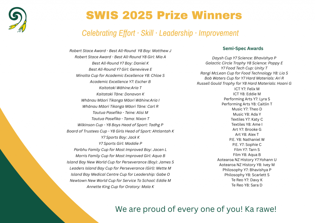 The final weeks of the year have been filled with celebration and meaningful farewells. We were delighted to share a memorable Leavers’ Evening, where our Year 8s celebrated their time at SWIS and the friendships and experiences that will stay with them. Our Prizegiving last night and our final assembly today were an opportunity to acknowledge and recognise the academic, sporting, and cultural successes of our ākonga throughout the year.