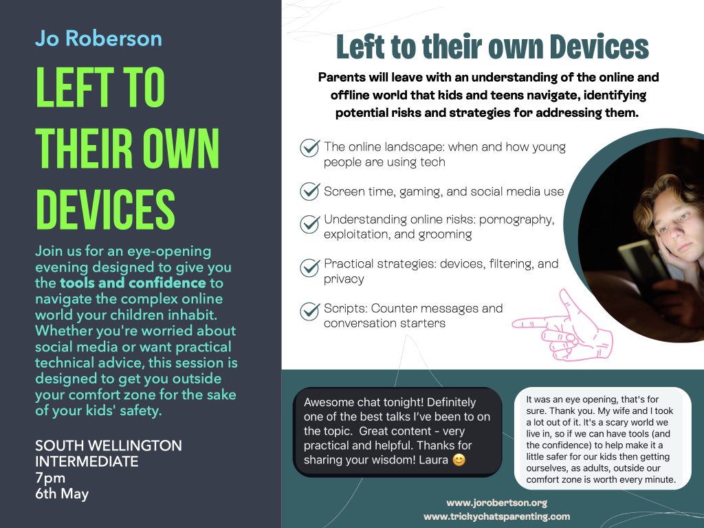 • 6 May – “Left to their own Devices” with Jo Robertson, 7pm in the school hall. See details below